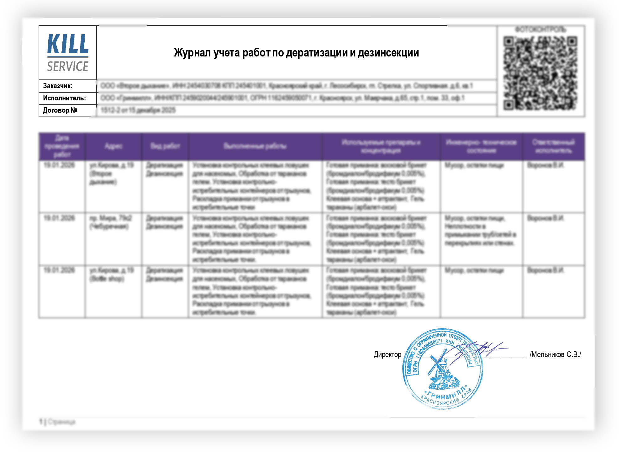 Ведём журналы учета как это требует САНПиН: с указанием ответственных, проведённых работ, используемых препаратов и их концентраций. Направляем по ЭДО вместе с закрывающими документами.