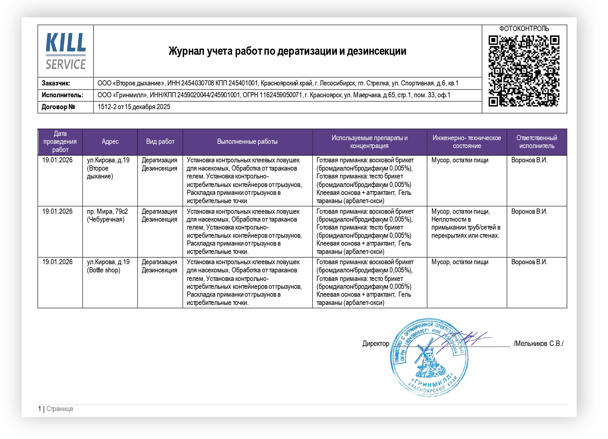 Ведём журналы учета как это требует САНПиН: с указанием ответственных, проведённых работ, используемых препаратов и их концентраций. Направляем по ЭДО вместе с закрывающими документами.
